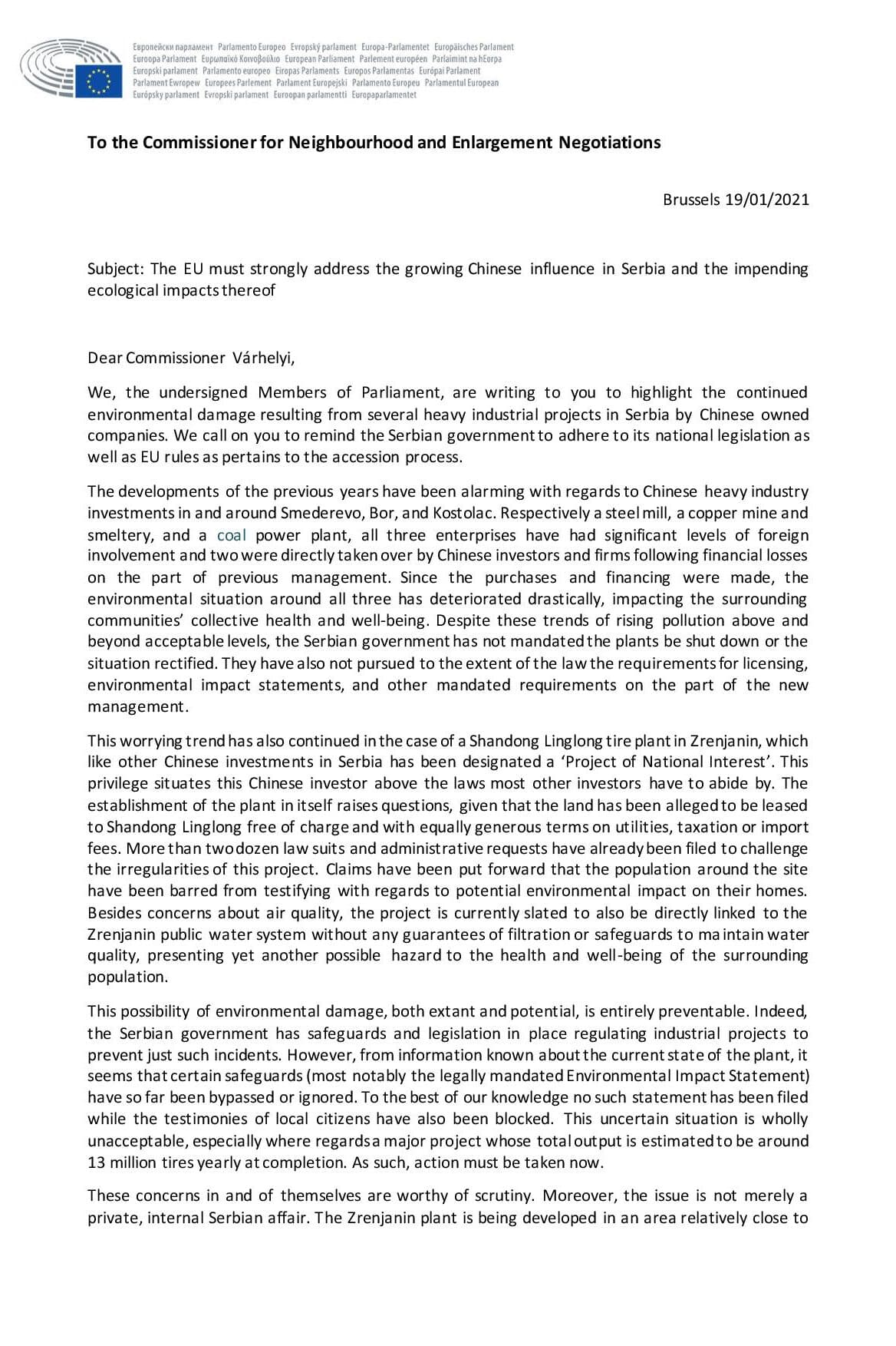Chinese influence is not just a security risk, but their investment is ruining the environment. Since Chinese investment came to support Serbian heavy industry, such as the steel mill in Smederovo or the coal power plant in Kostolac, the environmental standards have been deteriorating and pollution has risen. Another project is a tire plant in Zrenjanin, which potentially harms local water sources besides raising air pollution. This is a „project of national interest“ , so instead of complying with environmental standards, it even received special status with generous tax cuts. The European Union should not let this happen, because this hurts the environment both in Serbia and in the neighbouring countries too. Because of these investments Serbia is not adhering to their national rules and not complying with its commitments to the EU. Together with 26 MEPs we addressed Commissioner Várhelyi, who is responsible for enlargement, as he should demand compliance with all laws and standards and make the Serbian government move forward.