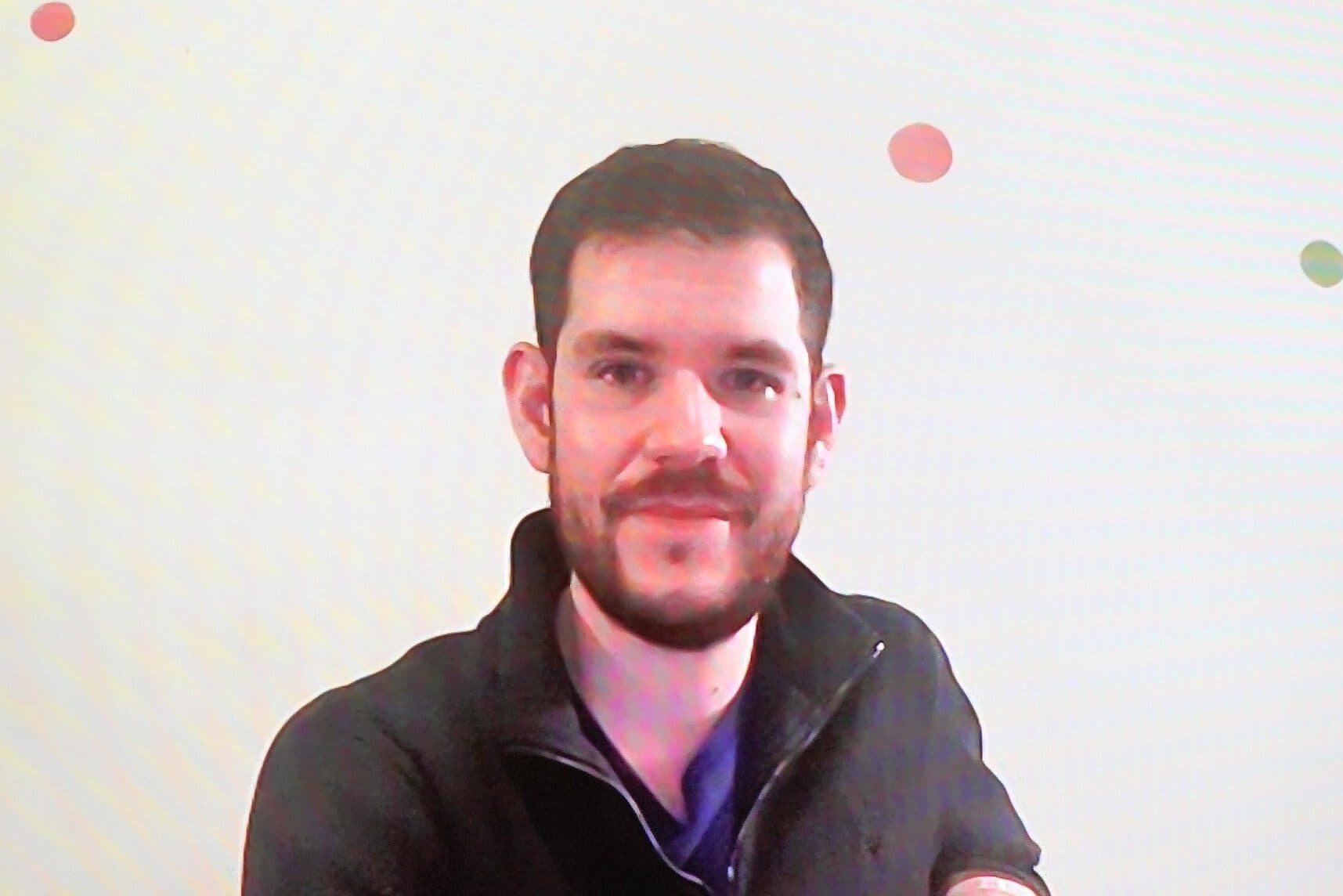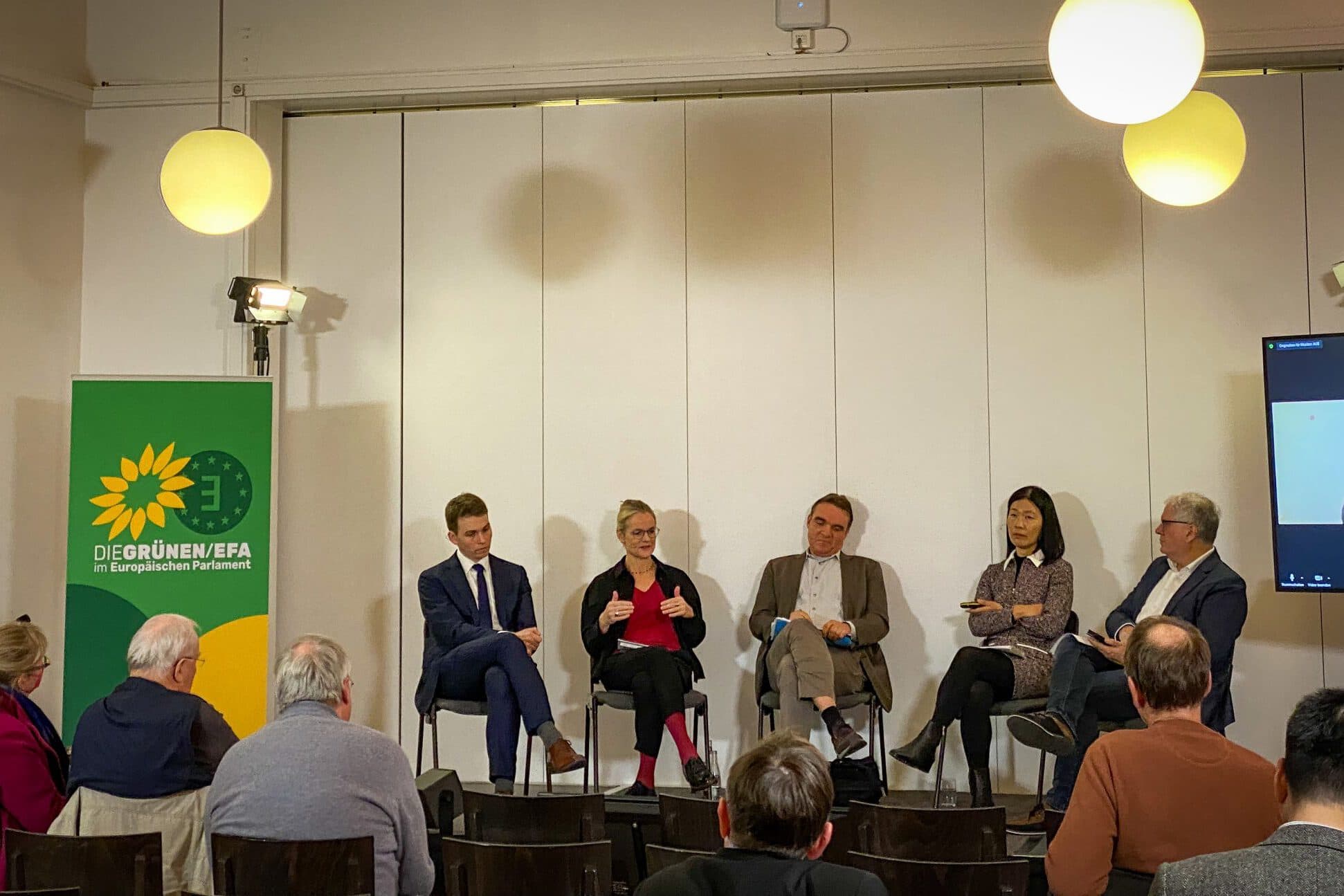 Links: Christoph Giesen per Zuschalte aus Beijing. Rechts, v.l.: Gregor Sebastian, Viola von Cramon, Dominic Sachsenmaier, Ottmar von Holtz